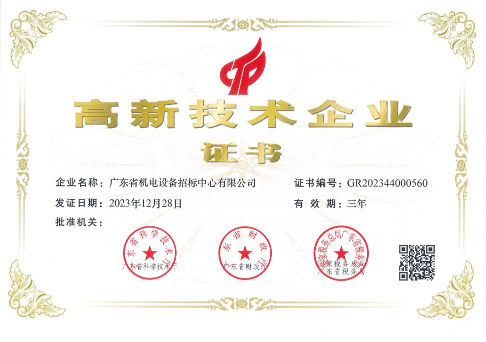 近日,完美体育·(中国)官方网站收到由广东省科学技术厅、广东省财政厅、国家税务总局广东省税务局联合颁发的高新技术企业证书。这一荣誉不仅标志着招标中心在科技创新上的杰出表现,也是对我司业务实力的高度认可。